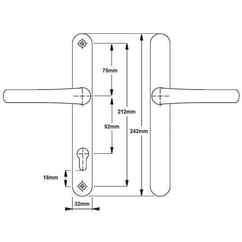 These Fab & Fix dummy handles from the Balmoral range have a sprung 92pz internal lever and a blank external lever designed to operate a slave lock with a half euro cylinder. This handle set is commonly used on French doors where external access is not usually required. With a backplate of 242mm x 32mm they are available in various finishes which all meet the requirements of BS EN 1670:2007 Grade 5 (480 hours) for Corrosion Resistance. The distance between the fixing screws is 212mm with the bottom screw positioned 18mm below the euro profile cut-out. They are supplied as a pair complete with fixings consisting of spindle & 2 colour co-ordinated screws.