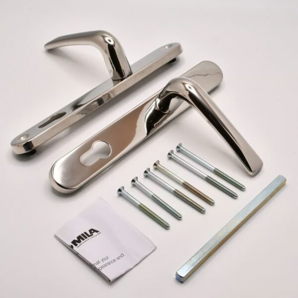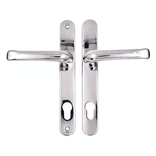 This handle has a backplate measuring 240x32mm and screw centres measuring 210mm, compatible with most 92mm PZ multipoint locks.