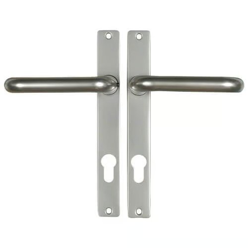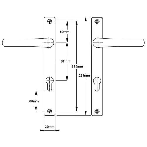 These Wilka handles have unsprung 92pz internal & external levers. With a backplate of 225mm x 30mm they are available in a silver finish. The levers are not fixed to the backplates so handing can be reversed on site. The distance between the fixing screws is 212mm with the bottom screw positioned 33mm below the euro profile cut-out. They are supplied as a pair complete with a spindle which is fixed to one of the levers. Fixing screws are not supplied.