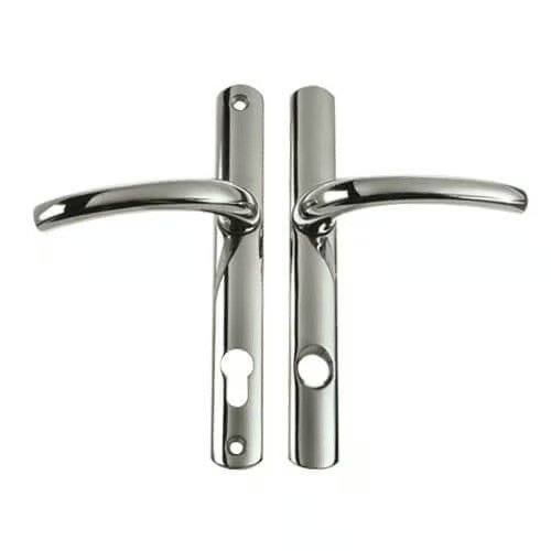 The Yale Platinum door handle range has been successfully tested to TS007:2012 and has achieved BSI’s two star Kitemark accreditation. They also meets the Official Police Preferred Specification requirements of Secured by Design and accredited with BSEN 1906:2010 grade 4. (200,000 cycles, 480 hours neutral salt spray exposure) These security handles with buit in cylinder guard have sprung 92pz levers on a backplate 245mm x 34mm. The distance between the fixing screws is 215mm with the bottom screw positioned 25mm below the euro profile cut-out. They are supplied as a pair complete with fixings consisting of a spindle and colour co-ordinated screws for PVC and composite doors.